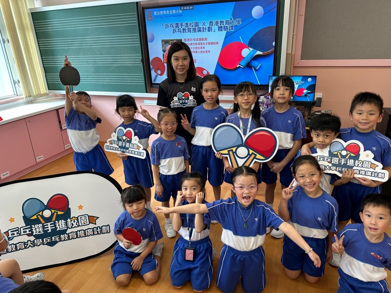 為培養小學生對乒乓球的興趣,發掘其運動天賦,並促進其全面發展,本校於十月八日為學生安排了「乒乓選手進校園x香港教育大學乒乓教育推廣計劃」活動,由奧運乒乓球獎牌得主李皓晴帶領專業教練及香港教育大學學生團隊,為學生介紹乒乓球的歷史起源和發展演變,及作為中國「國球」的文化意義,提升學生對國家歷史與文化的認識,增強文化自信與認同感。