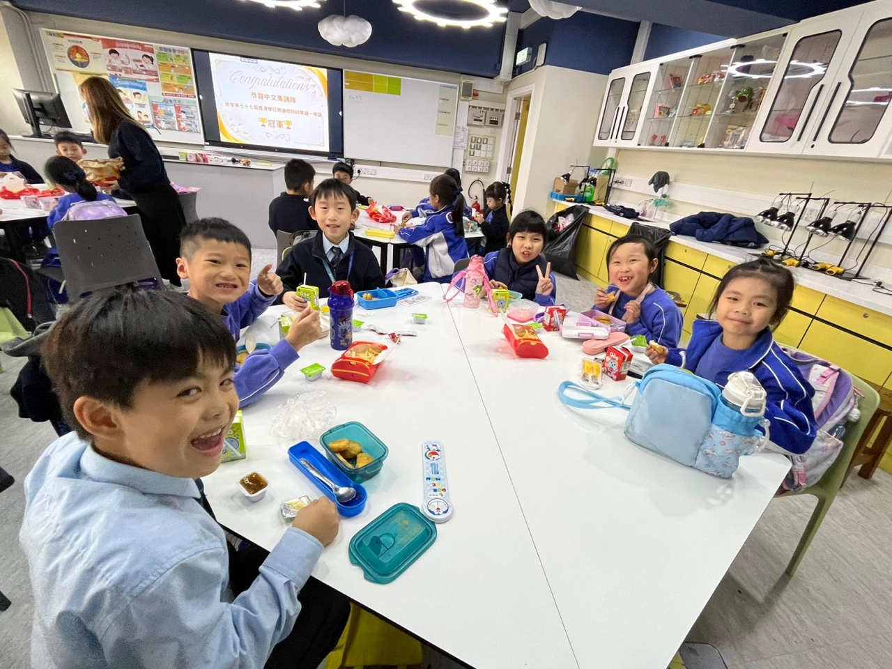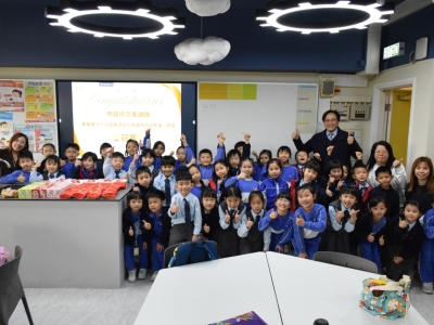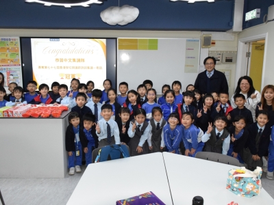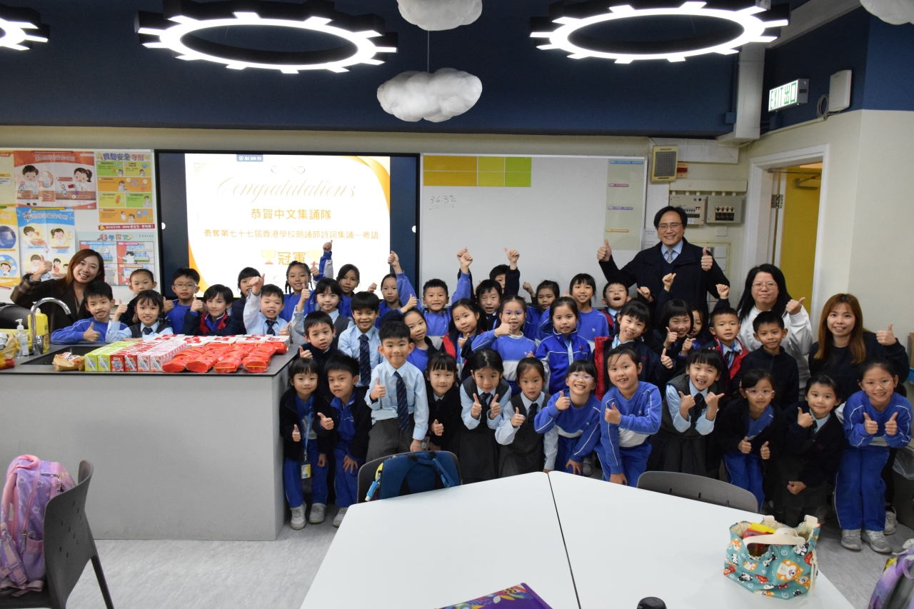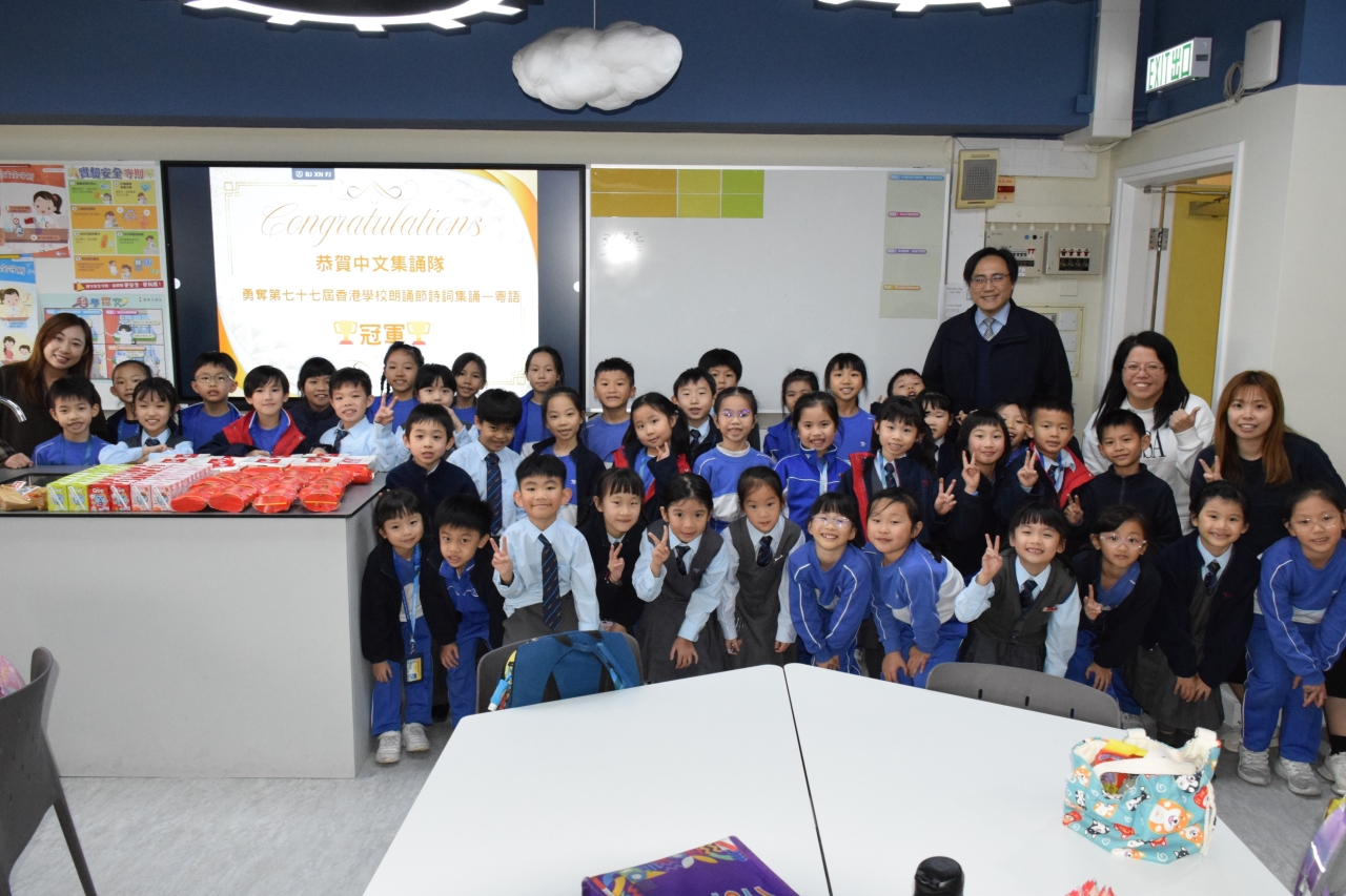 為恭賀本學年的中文集誦隊(小二學生)榮獲第七十七屆學校朗誦節詩詞集誦比賽(粵語)冠軍,陳校長參與中文集誦隊慶功宴,祝賀一眾中文集誦隊的師生及合照,給學生送上衷心的鼓勵。在慶功宴中,學生享用美食之餘,亦不忘老師一直以來的栽培與指導,整個過程恩典滿滿!