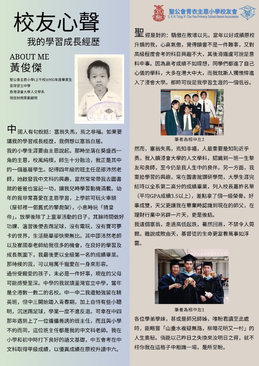校友心聲(黃俊傑)本校歷屆畢業生人材輩出,為了讓各校友及同學們能加強連繫,並承傳主恩,校友會推動校友撰文分享其學習心得及成長經歷,讓各位學弟學妹能從中獲得啟發。校友會現邀得黃俊傑校友分享「我的學習成長經歷」,分享生命成長的喜悅。
