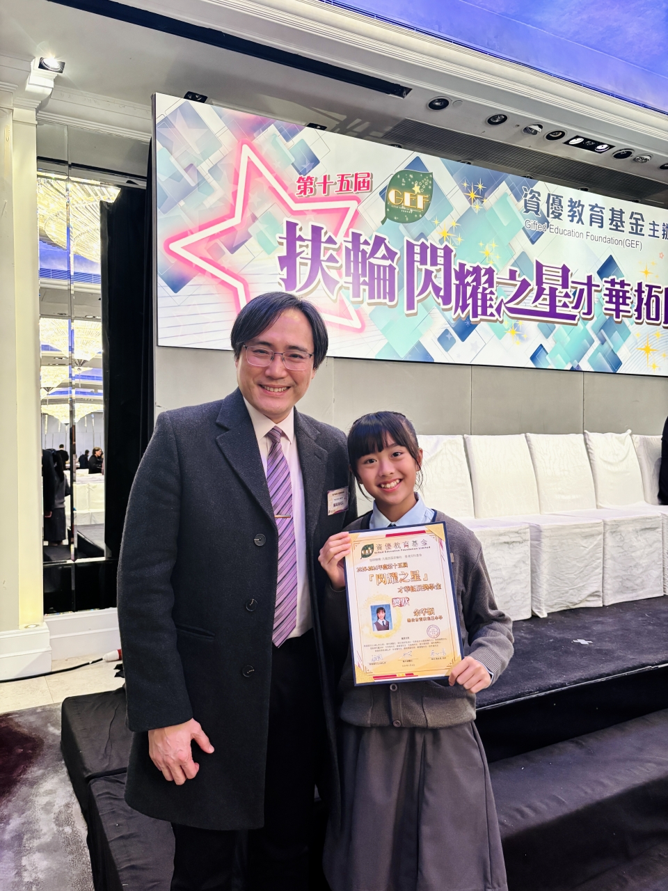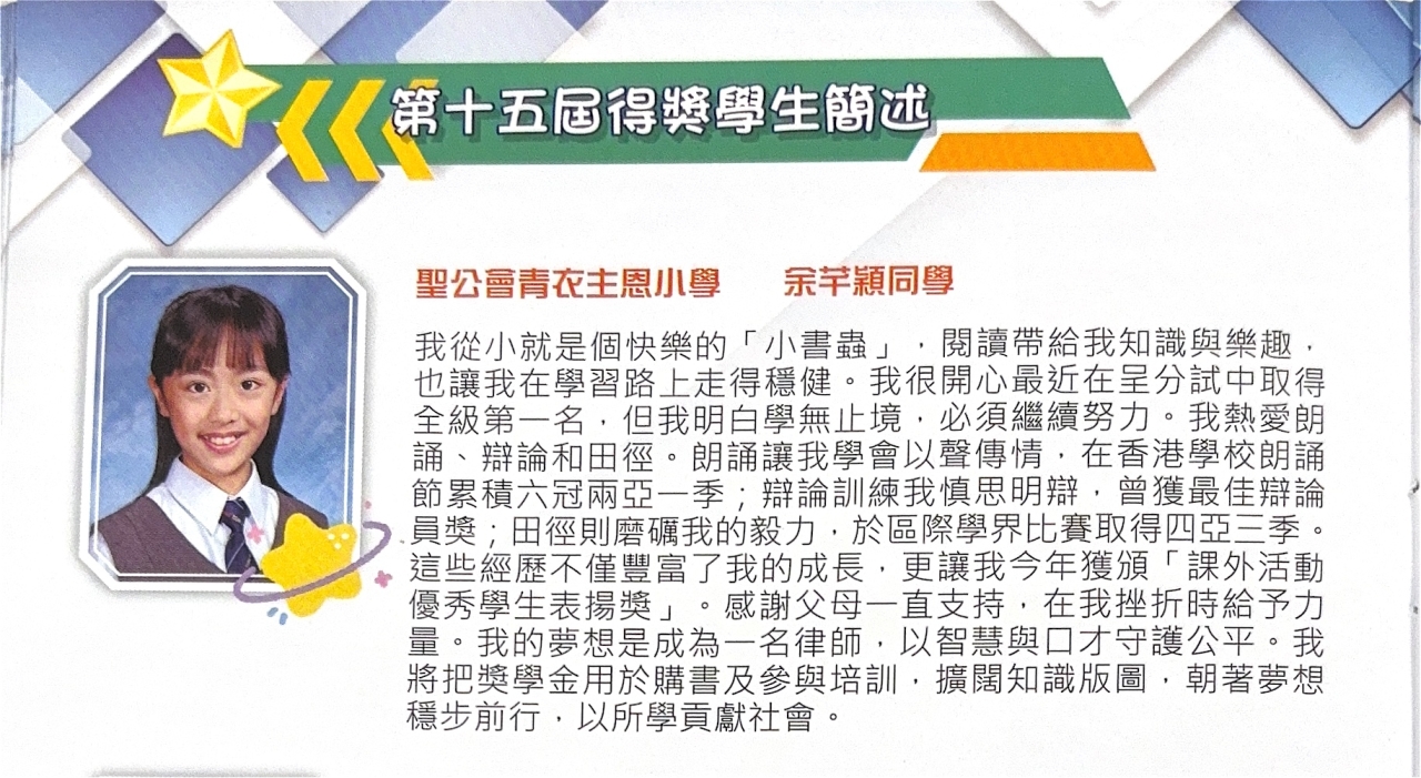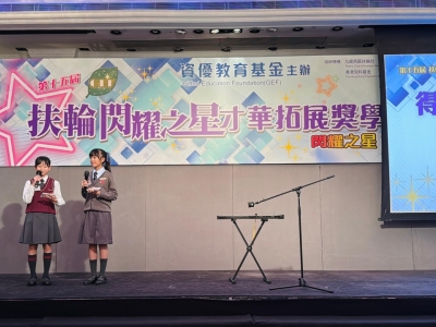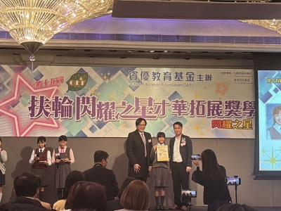 由資優教育基金主辦,九龍西區扶輪社及香港兒科基金協辦的「『閃耀之星』才華拓展奬學金」已完成評審程序,我校6A余芊穎同學從全港212位資優生中脫穎而出,憑卓越表現獲得「『閃耀之星』才華拓展奬」,獲頒獎狀及獎學金港幣六千元,並將獲邀參與由社會人士提供的支援活動、學習工作坊及各類培訓課程。是次獲獎實在有賴同學的努力堅持及師長的悉心栽培,確是可喜可賀,期望芊穎繼續努力,盡展所長。
